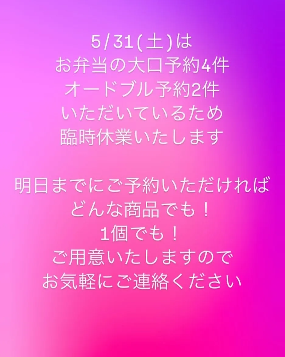 すみません! 2025/05/29 すみません! 今週も土曜日に臨時休業いたします。 今月は、土曜日の店舗営業がゼロとなりました。 大口予約の対応もしながら、なんとか営業できないかと思っているのですが、全てを2人で手作りしているので、大口予約が重なると、店舗営業が難しくなってしまうのです。 ご不便をおかけして申し訳ございませんが、ご理解いただけると幸いです。