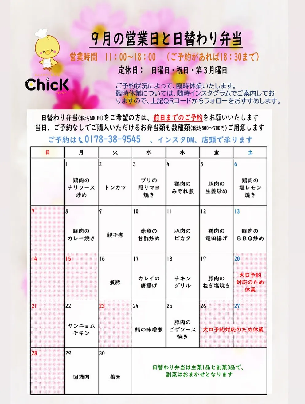 9/20(土)、9/26(金)、9/27(土)は、大口予約対応のため休業いたします。