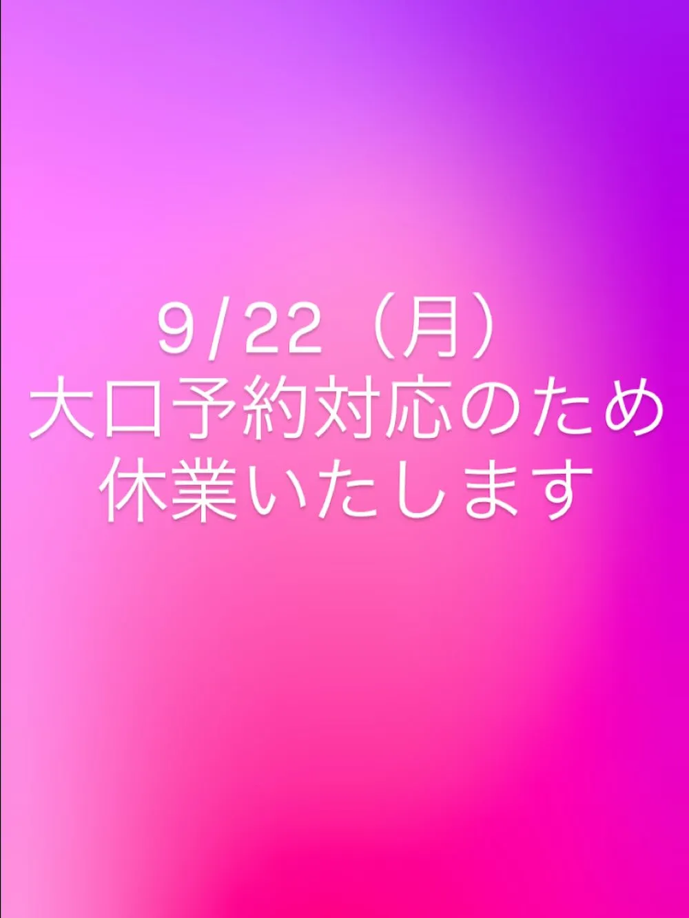 ご不便をおかけしますが、ご理解の程よろしくお願いいたします。 2025/09/01 ご不便をおかけしますが、ご理解の程よろしくお願いいたします。 翌23日(火)は定休日、また26日(金)と27日(土)は大口予約対応のため休業いたします。 お間違えのないようにご注意ください。
