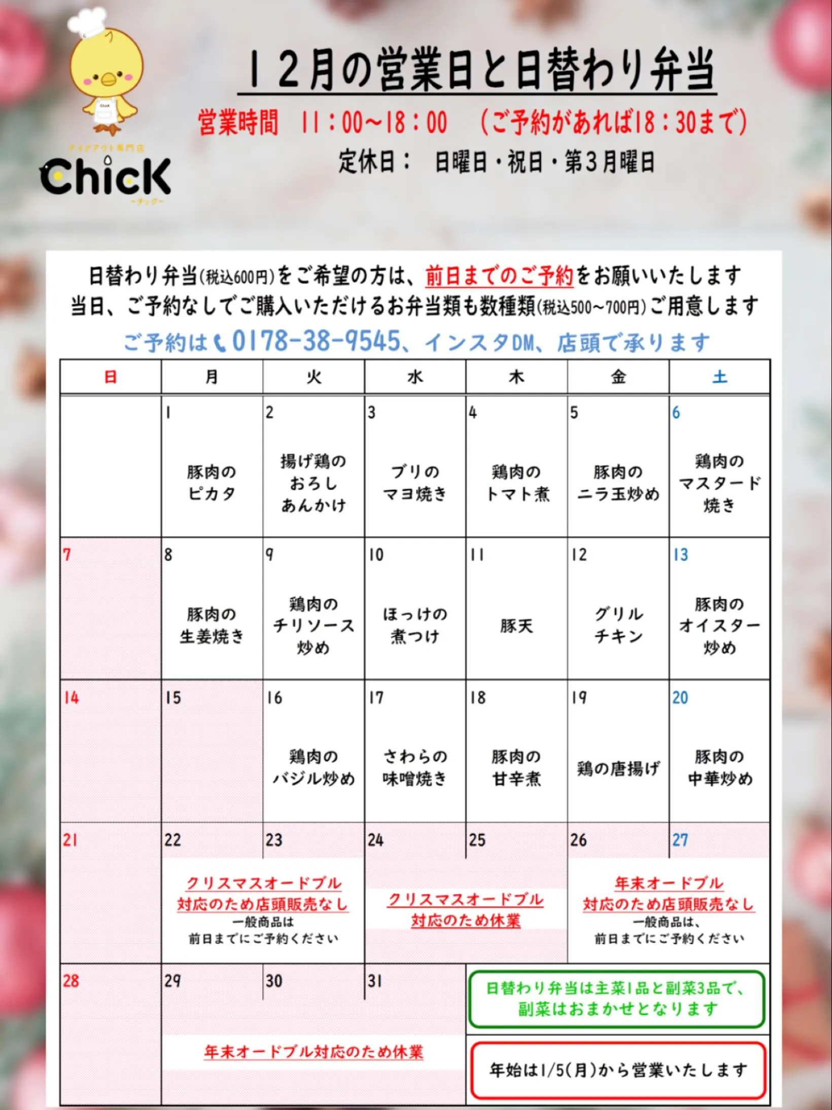 12月の営業カレンダーです。 2025/11/27 12月の営業カレンダーです。 下旬はオードブル対応のため、店頭販売休止または休業となります。 11/27現在、12月の大口予約はありませんが、今後の予約状況により、 臨時休業することもありますので、ご来店前にストーリー及び投稿の ご確認をお願いいたします。
